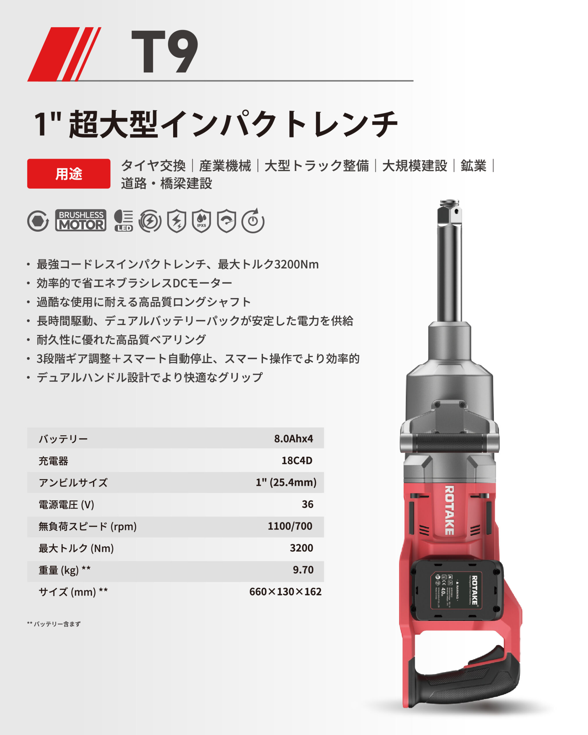 - ・最強クラスのコードレスインパクトレンチ(最大トルク 3200Nm)
